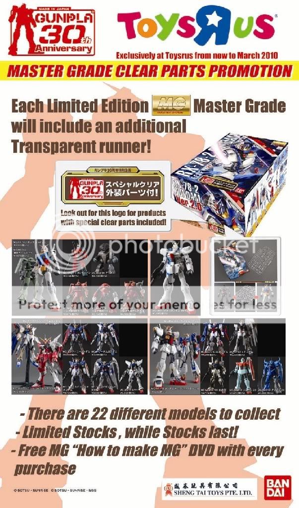 Fresh from our friends at Sheng Tai Toys comes this promo for Gundam Master Grade Clear Parts promotion @ Toys'R'Us stores in Singapore, from now til March 2010.Do keep a lookout for a specific logo which offers this promotion (below):