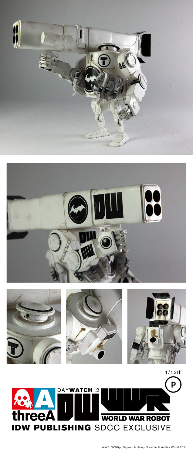 We've posted a WIP of the SDCC-exclusive WWRp "Day Watch" Heavy Bramble from IDW Publishing - now here is the reveal of the mecha-bruiser with decals, and as well looking splendid on stark black-n-milky-white from ThreeA Toys, who will also be bringing along loads of other toy-goodies to the annual event as well. Expect ordering details for this exclusive "early next week". Meanwhile - CLICK for full-uncropped image banner posted.